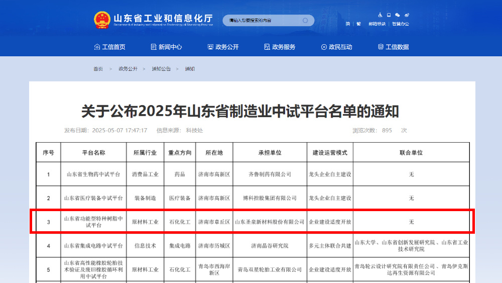 圣泉新材料“山东省功能型特种树脂中试平台”入选山东省制造业中试平台名单